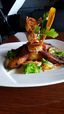 Certified Angus Beef loin strip steak, encrusted with peppercorns and grilled to perfection. Served with cinnamon gingered plantains, vegetables and peppercorn sauce - 40 Add Shrimp - 10.00