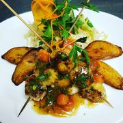 Sautéed shrimp in a mild curry sauce served with vegetables choice of mashed sweet potatoes or rice and beans
